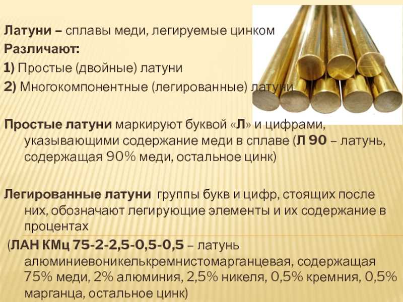 Обычно содержание меди в латуни составляет от 55% до 95%, а цинка – от 5% до 45%. Присутствие других металлов в сплаве позволяет получить латуни с различными свойствами, такими как стойкость к коррозии, твердость, способность к гибкости или паяемости.