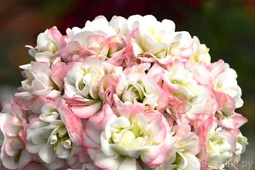 Особенностью этого сорта являются его цветки, которые распускаются в крупные соцветия и имеют форму пионовидных бутонов. Цветки Пеларгонии Април Снощ белые, с легким малиновым оттенком в центре. Они обладают приятным ароматом, который наполняет воздух свежестью и летним настроением.